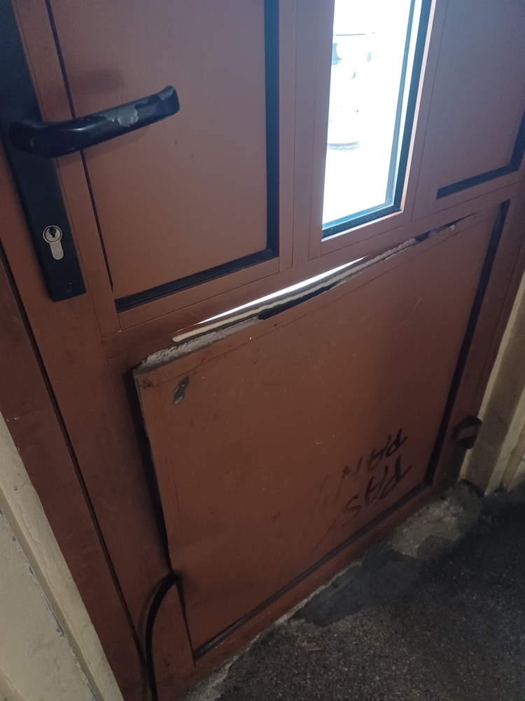 Zniszczenia objęły uszkodzenia 10 drzwi wejściowych.